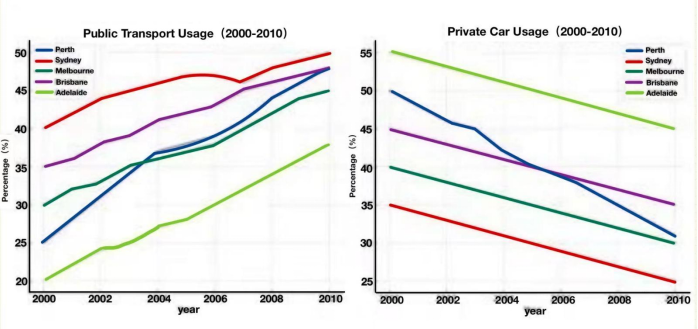 The line graphs illustrate the changes in commuter preferences for public transport and private cars across five cities in Australia (Perth, Sydney, Melbourne, Brisbane and Adelaide) from 2000 to 2010.