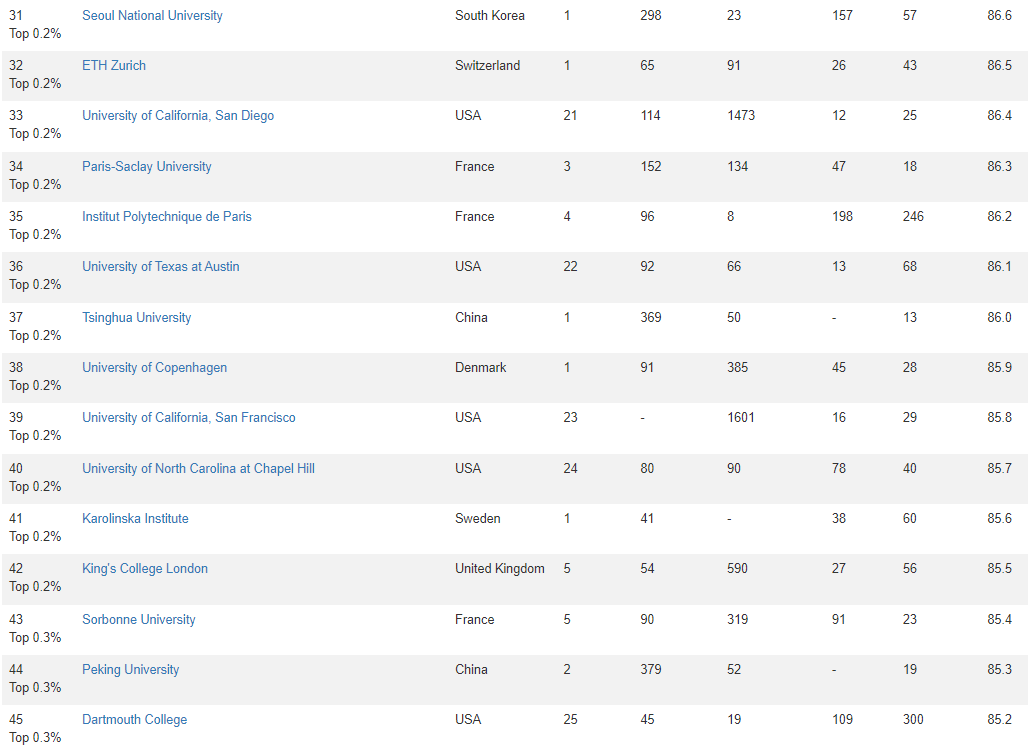 中国内地的清华大学(第37位)、北京大学(第44位)和中国科学院大学(第46位)进入榜单前50。