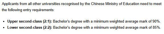 申请要求达到 2:2 学位的专业:本科加权平均成绩需达到85%及以上。
