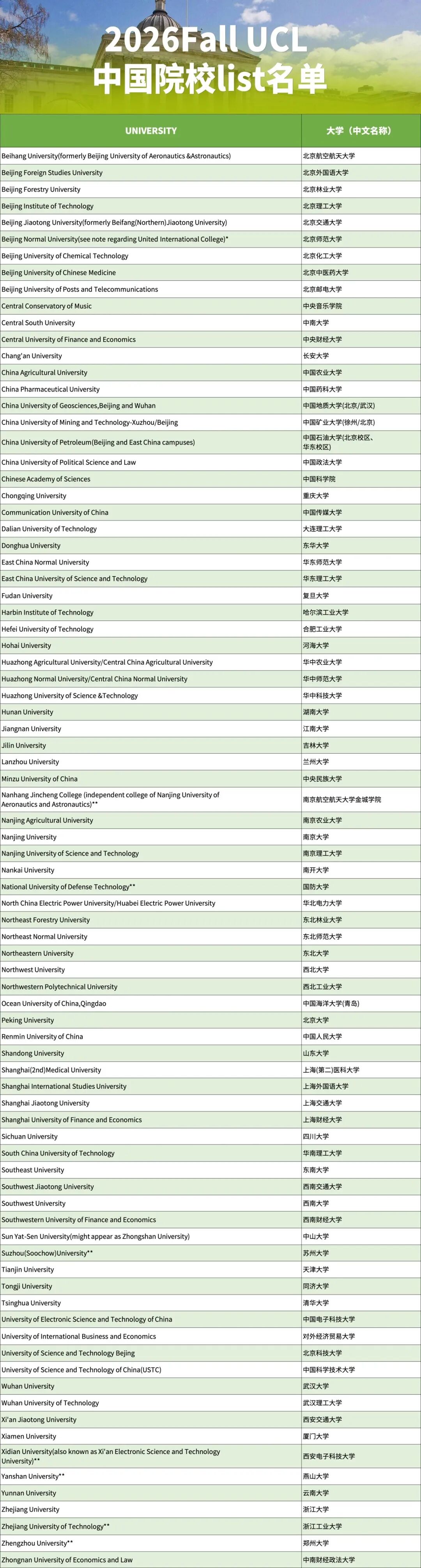 非认可清单内院校:对于本科院校未列入伦敦大学学院认可清单,但属于中国教育部认定的正规高校,在申请时需达到更高的均分要求: