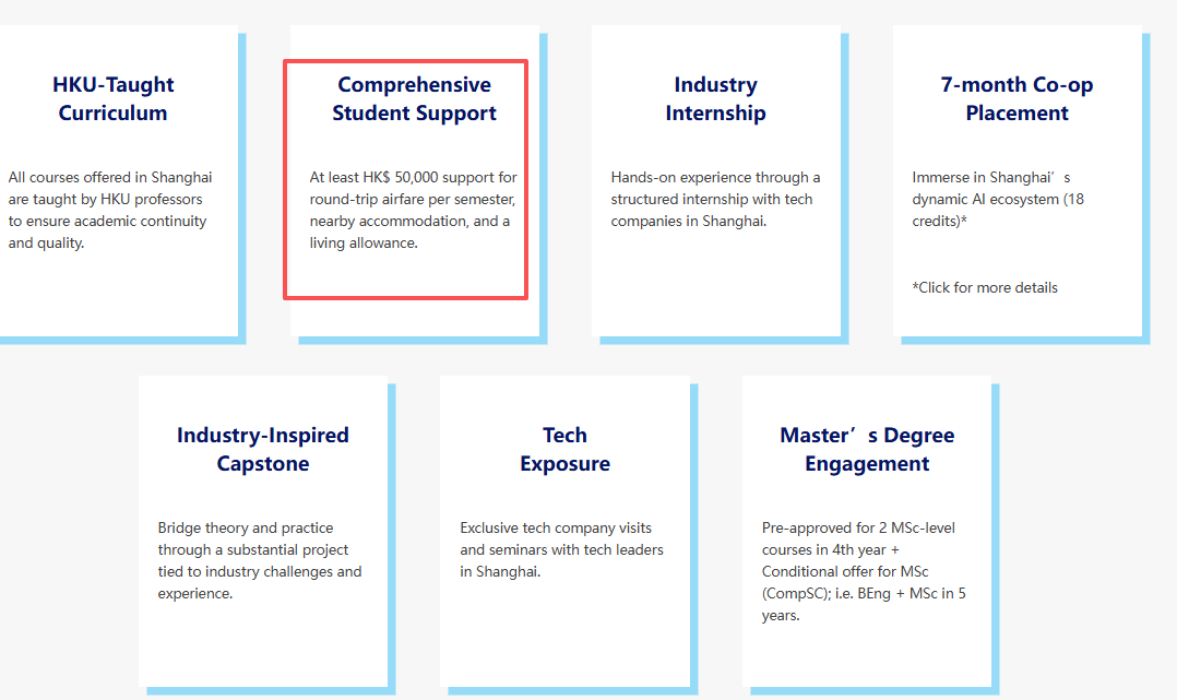 就读该项目的学生,每学期可获得至少5万港元资助,涵盖往返机票、住宿及生活津贴。