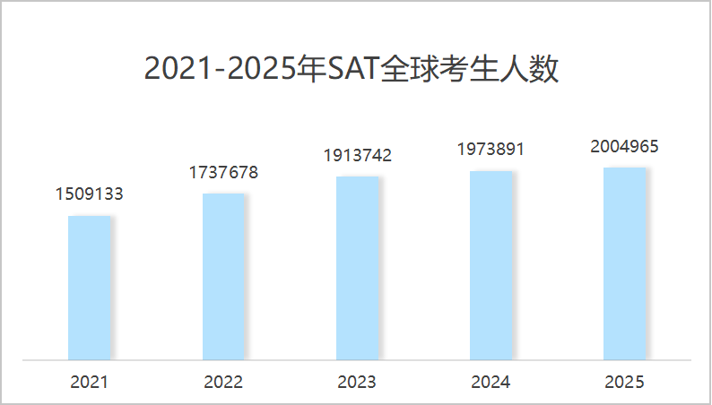 2025年SAT全球考生总数约200万,比去年多了3万左右!近几年考生人数一直在稳步上升,这也意味着想冲好学校的同学,竞争压力又大了一点。