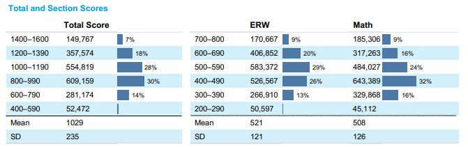 从全球考生的整体成绩不难看出,数学科目容易拿高分。在上图中显示的Math分数在700-800之间的考生有185,306人,占比9%;而ERW分数在700-800之间的考生有170,667人,占比 9%。