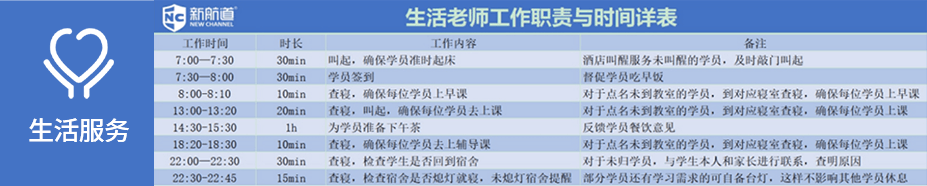 新航道出国留学封闭学习中心是包括教学、住宿和餐饮的一体化集训营,全程托管,封闭式管理。经验丰富的老师授课,助教全程跟踪辅导,督学督练,生活老师贴心陪伴,管理作息。